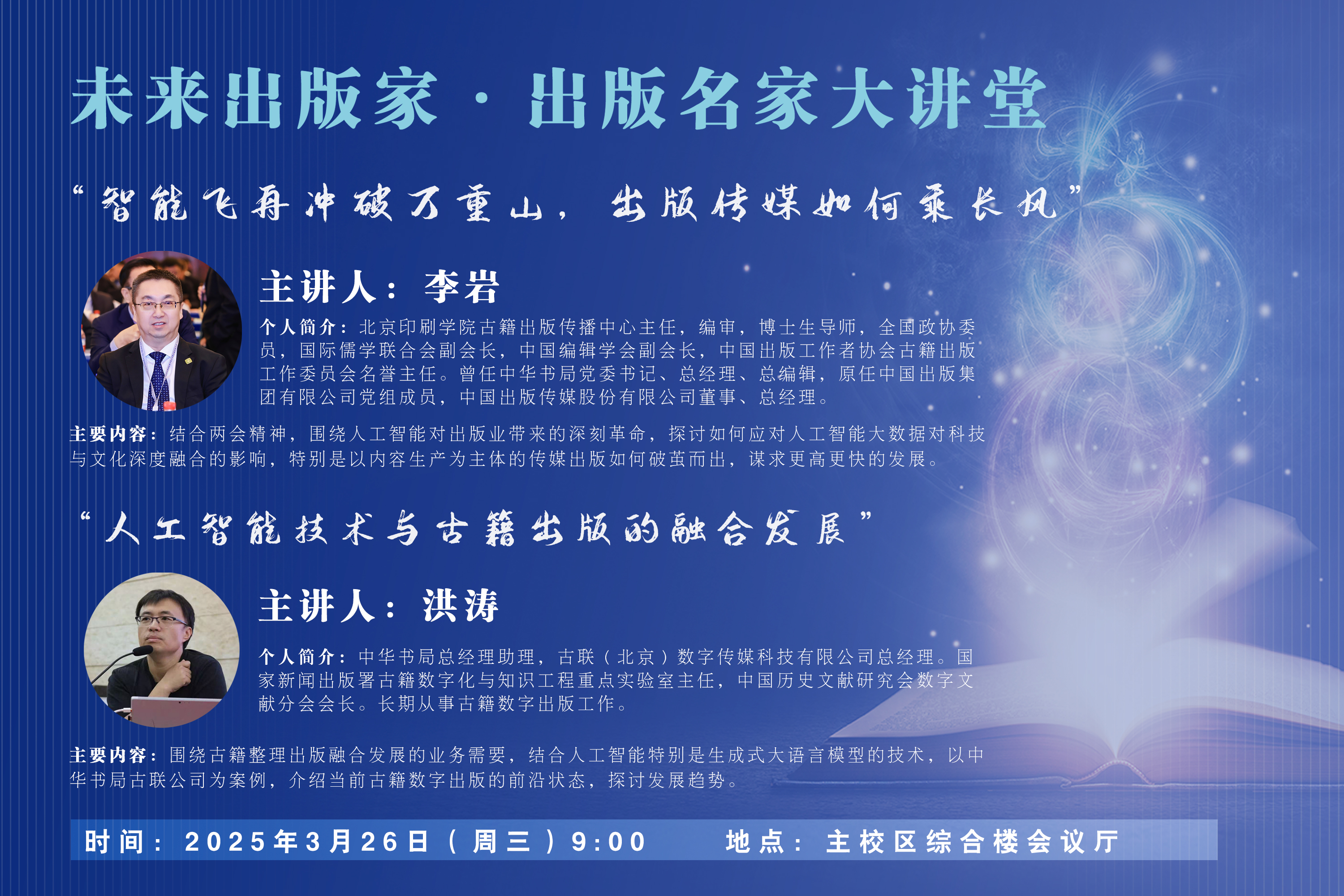 主要内容:结合两会精神,围绕人工智能对出版业带来的深刻革命,探讨如何应对人工智能大数据对科技与文化深度融合的影响,特别是以内容生产为主体的传媒出版如何破茧而出,谋求更高更快的发展。